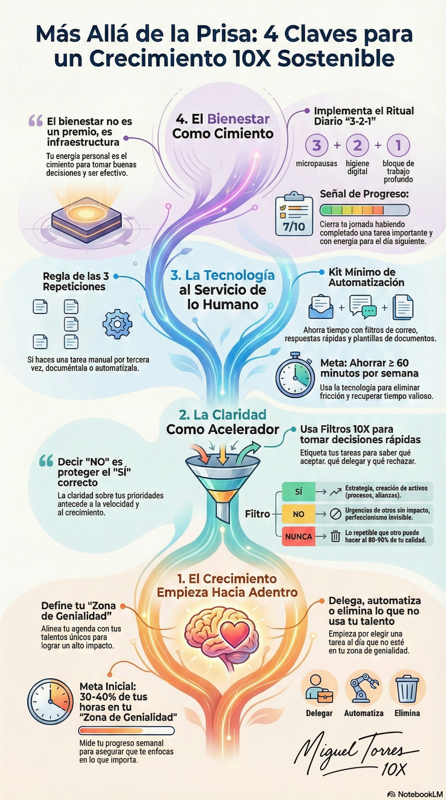Aquí va la solución que uso en mi empresa: 4 claves 10X desde adentro. Identidad y foco, filtros de claridad, tecnología como soporte digital que quita fricción, y bienestar como infraestructura. Es práctico, está pensado para gestión empresarial con IA en negocios, y habla de dueño a dueño.
